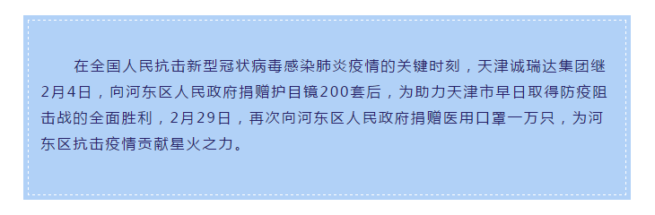 在企業(yè)的日常運行過程中,廣泛參與公益事業(yè)與政策宣傳,以實際行動踐行“努力成為一切社會化服務(wù)活動的優(yōu)秀參與者”這一愿景目標(biāo)。2017年,誠瑞達(dá)獲得天津市工商業(yè)聯(lián)合會授予的“天津市民營企業(yè)促進(jìn)就業(yè)百強(qiáng)企業(yè)”、“天津市民營企業(yè)社會捐贈百強(qiáng)企業(yè)”稱號。